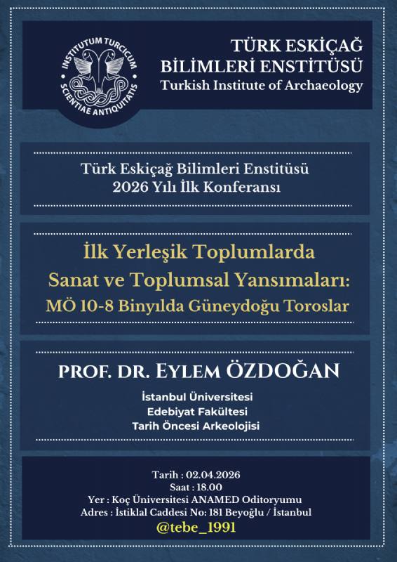 Prof. Dr. Eylem Özdoğan tarafından verilecek 'İlk Yerleşik Toplumlarda Sanat ve Toplumsal Yansımaları: MÖ 10-8. Binyılda Güneydoğu Toroslar' başlıklı konferans, 02.04.2026 tarihinde, saat 18:00'da, ANAMED oditoryumunda gerçekleştirilecektir.